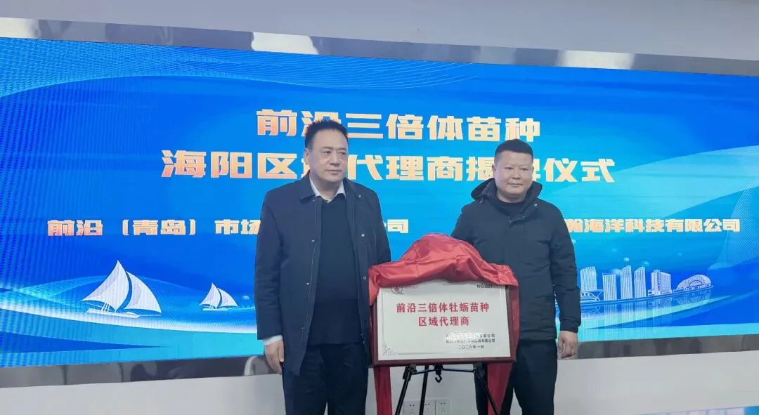 会议现场,青岛前沿海洋种业有限公司总经理郭希瑞,与山东富瀚海洋科技有限公司副总经理于文东,共同为前沿三倍体苗种海阳区域代理商揭牌。