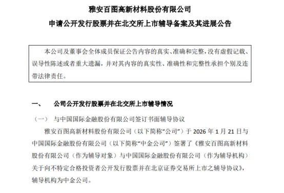 近日,据中国证券监督管理委员会网上办事服务平台信息显示,四川证监局受理了雅安百图高新材料股份有限公司提交的向不特定合格投资者公开发行股票并上市辅导备案的申请。