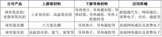 公司主要产品包括球形氧化铝、氮化物、亚微米氧化铝等功能性粉体材料,广泛应用于新能源汽车、储能、光伏、网络通信、消费电子、超算中心、人工智能、芯片制造、芯片封装、高性能覆铜板以及其他细分领域,下游为国内外各大导热材料厂商。