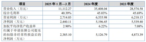 2023年度、2024年度及2025年1-3月,公司营业收入分别为28,574.58万元、35,408.04万元和11,112.27万元;净利润分别为5,539.40万元、5,196.45万元和2,440.11万元;扣非净利润分别为4,873.39万元、5,126.79万元和2,385.10万元。