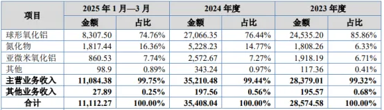 报告期内,公司主营业务收入产品结构较为稳定,球形氧化铝、氮化物、亚微米氧化铝等导热粉体材料是其主要来源。其中,球形氧化铝是公司的核心产品,报告期各期公司球形氧化铝产品的收入占营业收入的比例分别为85.86%、76.44%和74.76%;氮化物和亚微米氧化铝产品可进一步支撑客户的高导热需求,是公司产品矩阵中不可或缺的部分。随着公司技术不断积累成熟及下游市场需求逐步多样化,公司氮化物和亚微米氧化铝产品的销售金额和占比有较大提升。