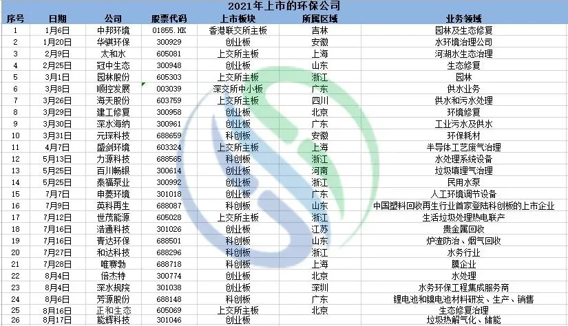 时间来到2021年,在全球IPO市场共同发力的大背景下,环境企业上市大潮迎来又一波的井喷,1-8月中旬已有26家企业登陆资本市场,上市企业业务覆盖范围也从水环境、水生态、市政供水到生活垃圾处理、环境修复以及再生资源回收利用等领域。