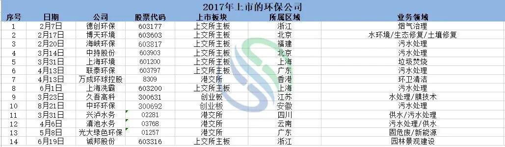这要从2017年IPO开闸说起,这个时期,环保企业迎来上市高峰,这一年国家产业政策鼓励节能环保企业上市融资,支持企业利用资本市场做大做强,据中国水网当时的不完全统计,2017年成功上市的环保企业有:博天环境、德创环保、滇池水务、中国光大绿色环保、海峡环保、联泰环保、上海环境、上海洗霸、万成环球控股、兴泸水务、中持股份、中环环保等14家之多。