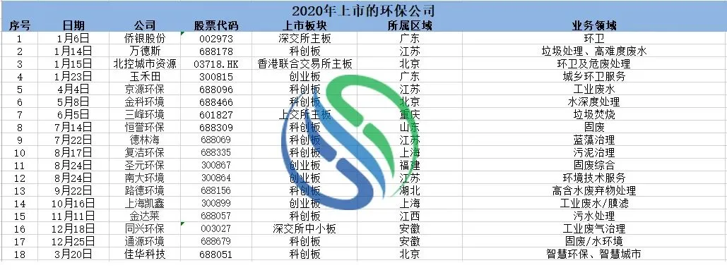2020年,疫情之下,我国多层次资本市场启动全面深化改革,这一年新三板精选层开闸、创业板实施注册制、新三板转板规则出炉、科创板迎来开板一周年……随之而来的是中国IPO大年,在整体相对宽松的资本市场环境下,有近30家环保企业上市过会,其中18家挂牌上市,包括“中国环卫第一股”侨银环保、在垃圾焚烧发电行业奋斗20余年的三峰环境,以及登陆科创板的万德斯、金科环境、复洁环保、路德环境、京源环保、恒誉环保、通源环境、金达莱、德林海,登陆创业板的南大环境、圣元环保、玉禾田、上海凯鑫等。