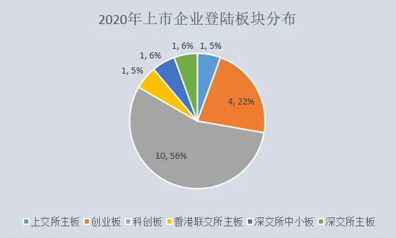 2020年科创板开始发力,环境领域上市的18家企业,有10家选择登陆科创板,4家选择创业板,通过科创板与创业板两大板块上市的企业占比将近八成,上交所、深交所、港交所主板上市企业分别只有1家,总占比不到两成。