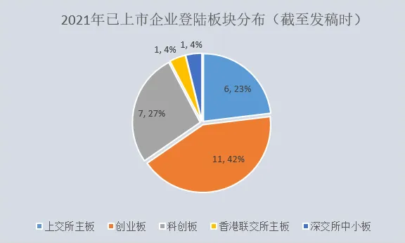 2021年,科创板优势继续,上半年资本市场共计86家企业在科创板上市,同比上升近1倍,IPO数量占比35.1%,募资金额共计692.08亿元,IPO规模占比33.07%,其中环境领域科创板上市企业占据了7席,创业板上市企业则高达11家,上交所和香港联交所主板上市企业总共7家,占比不到三成。