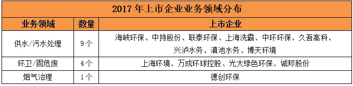2017年上市的环保企业业务领域还比较集中,大致可归纳为供水/水处理、环卫/固危废、烟气治理等三大领域,上市企业几乎是清一色的以环保PPP、BOT工程投资运营驱动做大的业界龙头企业,如老牌固废国企上海环境、水业十大影响力企业中持股份、光大集团旗下光大绿色环保以及中环环保、博天环境、兴泸水务、滇池水务等。
