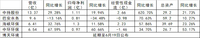 中国水网根据市值状况和主营业务选取了5家中小型水务环保企业进行观察。其中,截止到4月27日,已经披露年报的公司有:中持股份、海峡环保、巴安水务和中环环保四家;博天环境公布受新型冠状病毒肺炎疫情影响,审计年报延期至6月19日披露。