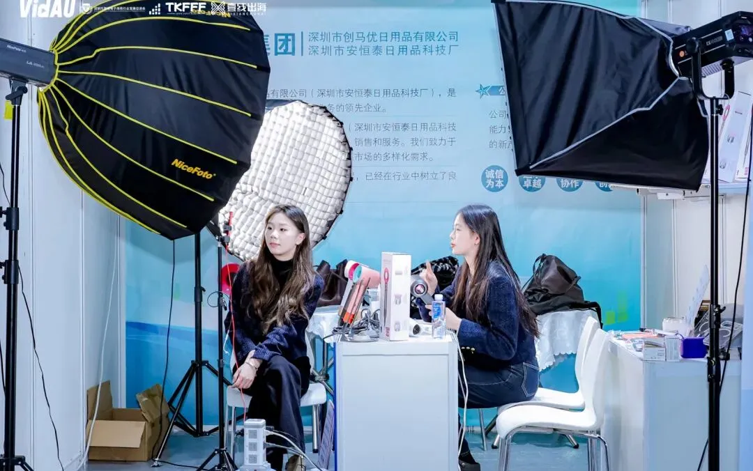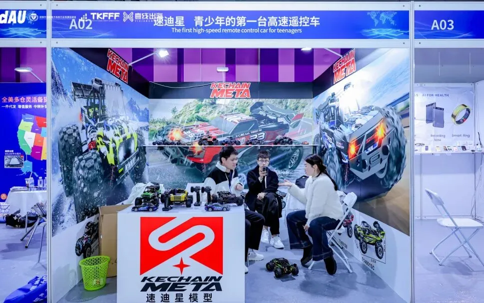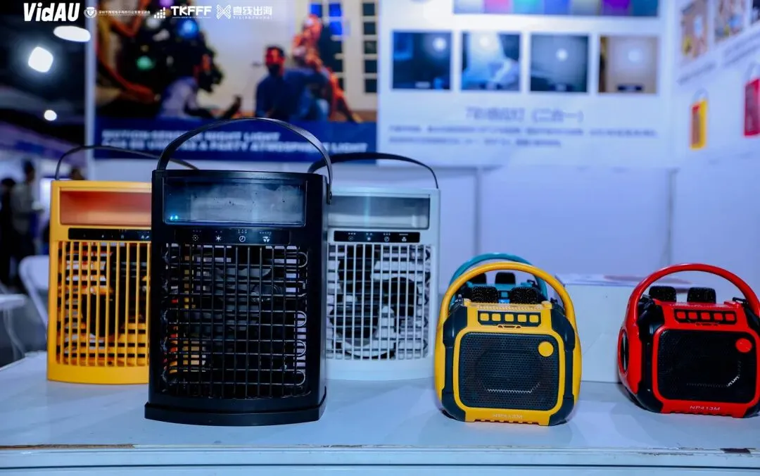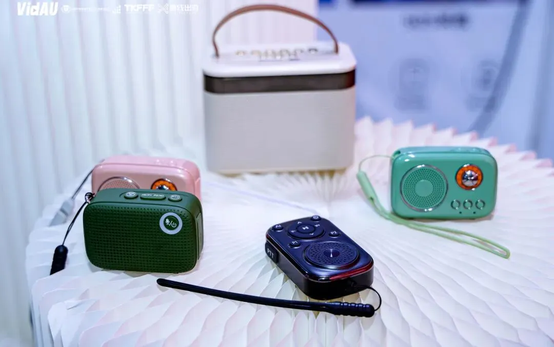 展会现场展品琳琅满目、品类齐全,涵盖AI玩具、复古留声机、智能小夜灯、装饰彩灯、时尚饰品、腕表眼镜、电动剃须刀、遥控赛车等诸多产品,覆盖家居、数码、美妆、玩具等热门出海赛道。