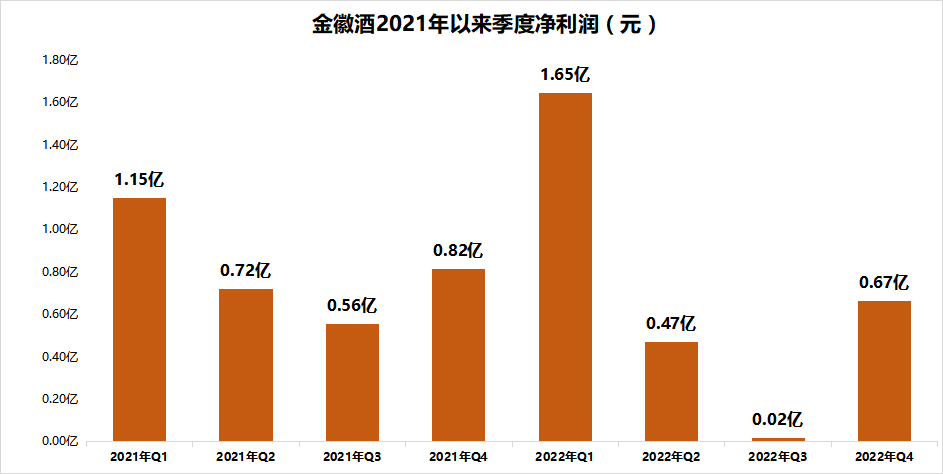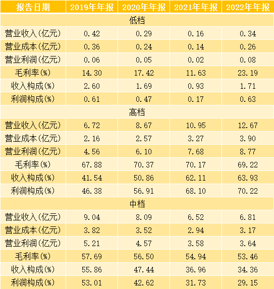 金徽酒2022年报显示,公司实现营业收入2.80亿元,同比增长12.49%;实现归母净利润2.80亿元,同比下滑13.73%。金徽酒拟每10股派发现金股利3元(含税)。分季度来看,金徽酒2022年一季度归母净利润1.65亿元,同比增长42.78%,随后三个季度高开低走,归母净利润均同比下滑。特别是三季度金徽酒归母净利润0.02亿元,同比下滑96.68%。四季度在国庆、双十一、圣诞、元旦等多个消费场景刺激下,金徽酒实现归母净利润0.67亿元,虽然相比2021年四季度下滑18.63%,但四季度盈利表现好过二三季度。2022年金徽酒毛利率为62.78%,较2021年的63.74%下滑近1%。金徽酒毛利率下降与低端酒品收入大幅提升,高端和中端酒品毛利率小幅下降有一定关系。但毛利率小幅下滑并非坏事,懂酒哥分析年报发现金徽酒产品结构升级趋势明显。金徽酒2022年低端白酒实现营业收入0.34亿元,较2021年的0.16亿元提升112.50%。从毛利率看,2021年低端酒品毛利率为11.63%,去年升至23.19%。毛利率提升超过10%,说明公司在完成去低端化的过程中,白酒价格抬升,对公司经营发展是有利因素。再看高端白酒,在宏观经济稳定向好与消费升级背景下,高端消费持续扩容,消费者更加追求产品的品质,这也成为白酒产业发展的重要方向。2022年金徽酒高端白酒毛利率为69.22%,下滑近1%,但毛利下滑带来的是公司营收总量和营收占比提升。高端白酒实现营业收入12.67亿元,同比增长15.71%;收入构成提升至63.93%,同比增长2.93%;利润构成提升至70.22%,同比增长3.11%。金徽酒高端白酒收入、利润构成提升,是公司中档白酒的升级过程,数据也可看出中档白酒这两项数值同比下滑。2022 年,金徽酒在 " 量质并举,提质增效 " 的生产方针指引下,依托秦岭核心产区优势及金徽生态白酒酒庄产能优势,酒品在保障优质品质的同时,产销超额完成任务。整体来看,金徽酒低端白酒毛利率提升,高端白酒销量提升,是非常积极的两大信号。图表:金徽酒经营项目按产品划分