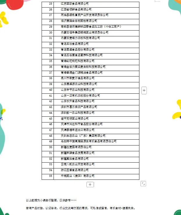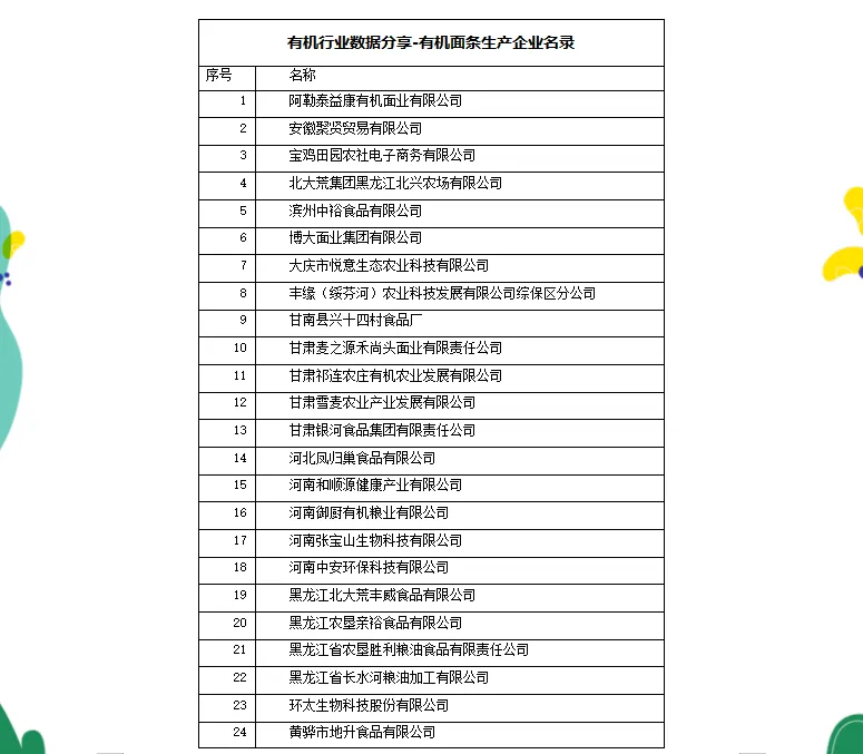 2024年挂面行业总产量720万吨,销售额突破800亿元,其中高端挂面产品占比已提升至32%,有机挂面是其中的重要组成部分。针对婴幼儿、老年人等特殊群体,行业通过智能烘烤、精准切丝、低温干燥等工艺保持挂面口感与营养;同时,针对杂粮挂面易断条等技术难题,正在通过工艺创新进行突破。目前,经过中国有机认证的面条生产加工企业共有55家,具体如下: