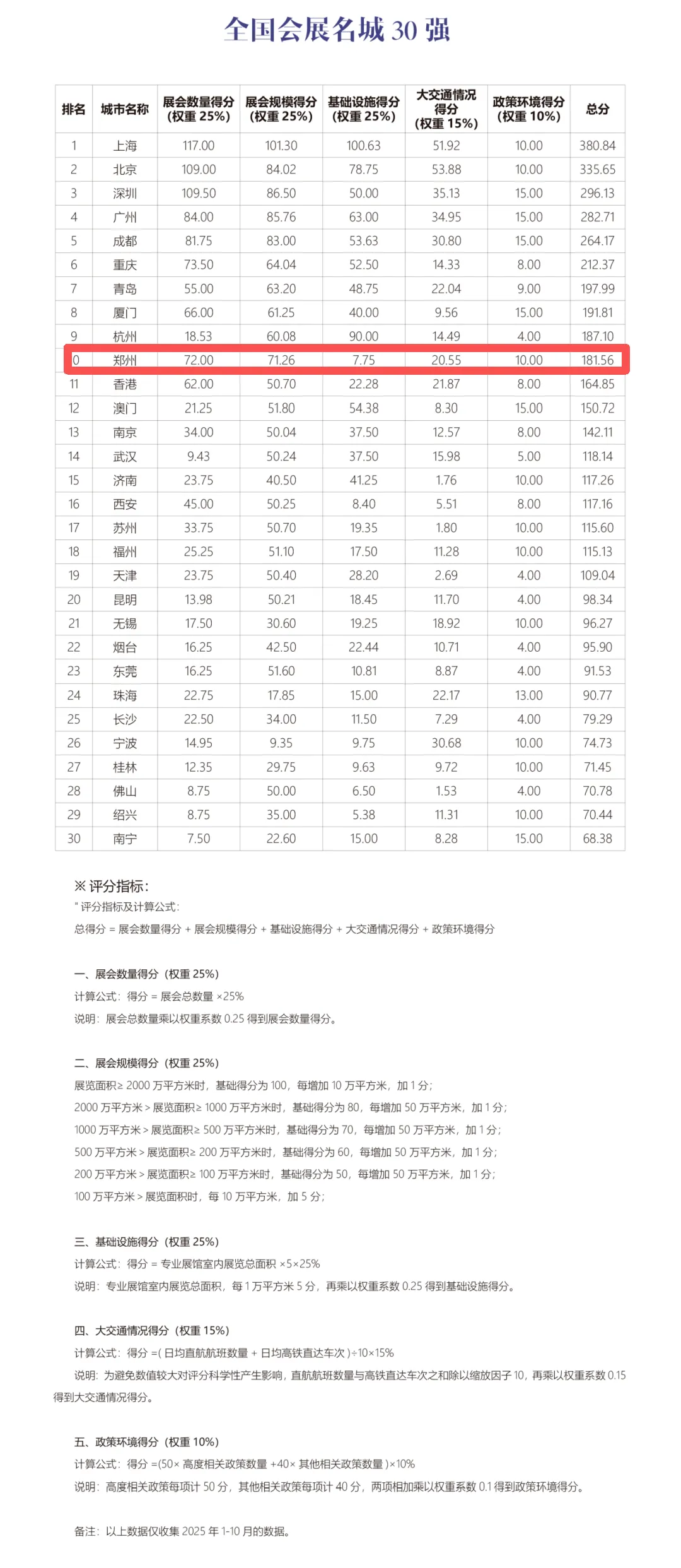 据《中外会展品牌排行榜》所发布信息,2025年【郑州】已位列“全国会展名城30强”榜单的第十名。郑州作为会展名城的优势主要体现在区位交通、产业基础、政策支持、场馆设施、人才储备五大方面,这些优势共同构成了郑州会展业发展的核心竞争力。