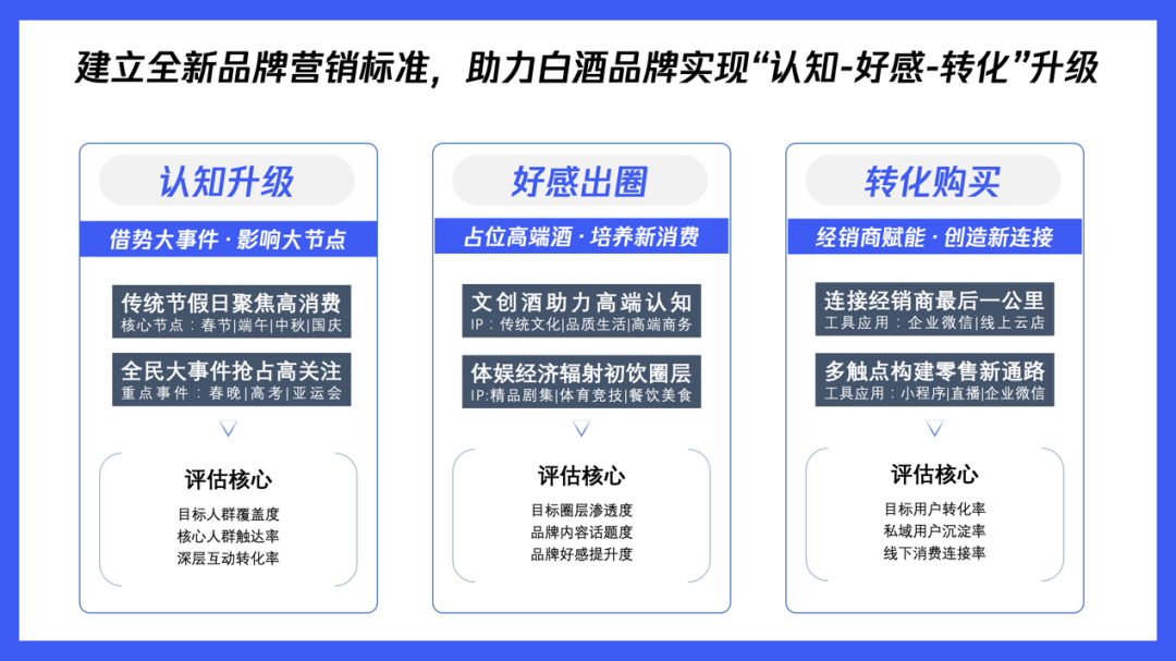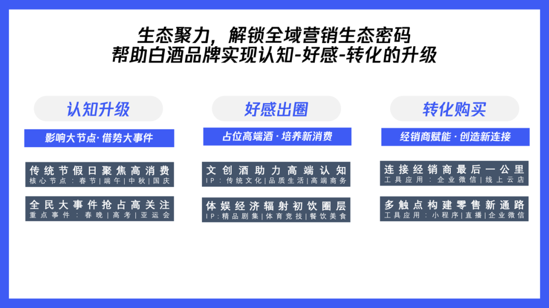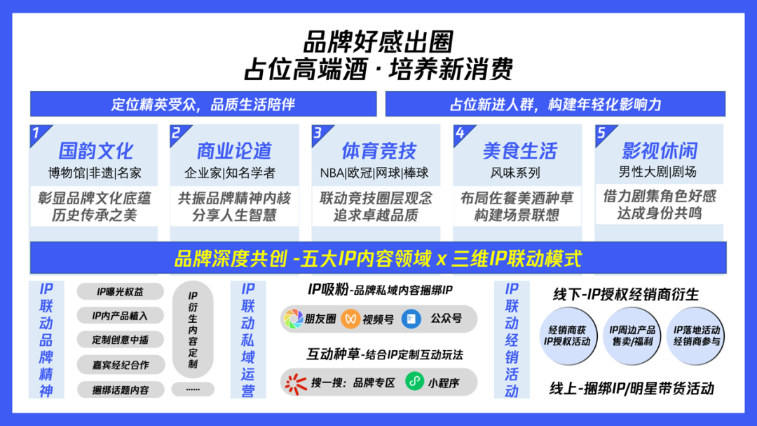 尹冠群指出,白酒消费场景在今年全面复苏,将直接拉动白酒消费量的增长。尹冠群进一步为品牌提炼了消费市场的两大“传承”与五大“进化”,帮助白酒品牌洞悉消费心理和供需变化,把握增长机会。基于白酒行业的传承与进化,尹冠群为品牌未来营销打法给出建议:品牌应该从“认知升级-好感出圈-转化购买”三个关键环节入手,因势而动升级营销策略。而持续进化的腾讯全域生态,凭借10亿+的用户覆盖、多样化的丰富触点和生态内的紧密联动,为品牌打造以用户为中心的品效营销版图提供了坚实的地基。抓住全民大事件和传统节假日等营销节点,实现对目标人群的大面积覆盖。腾讯生态拥有朋友圈、视频号、搜一搜等多样化、广覆盖、高互动的创新资源,帮助品牌抓住用户注意力,提高品牌热度。同时,品牌也能够借势全域生态的内容能力,聚合节点人群关注度,打透不同圈层,实现差异化的品牌营销。以毛铺的合作为例,品牌选择视频号等三端同步直播品牌发布会,通过腾讯生态全域触点为直播活动引流,通过互选广告联动军事、财经、美食多圈层KOL发酵传播,实现在不同用户圈层的声量引爆。• 五大IP内容领域x三维联动模式,深度共创实现好感出圈:相比起其他行业,白酒产品具备独特的文化属性,因此,品牌可以通过深度的内容营销,打破圈层触达深度人群,强化与消费者的情感连接。腾讯的全域生态中,积累了不同维度的多样化优质内容资源,品牌可以从国韵文化、商业论道、体育竞技等五大IP领域着手,通过与IP的三维深度联动,实现对精英受众、新进人群等白酒核心圈层的有效占位。以劲酒和《雪中悍刀行》的IP合作为例,品牌通过选择男性顶流大剧IP,绑定高光角色在剧集中植入定制彩蛋,强调互动的定制化玩法成功引爆社交圈层,大大提高了剧集核心受众对品牌的好感,带动品牌成功出圈。针对白酒行业的生意特性,腾讯广告直击生意痛点,为品牌定制三大核心营销链路,通过腾讯全域生态的数字化能力,帮助品牌建立以用户为中心的深度连接,促进高效转化。线下直连:通过原生落地页为用户推送附近门店并吸引留资,方便深度运营,真正打通线上引流-到店转化的最后一公里,提高转化效率会员沉淀:通过原生落地页将用户引流至企业微信中,以企业微信为节点持续运营,推动成交和复购线上直购:最大程度缩短转化链路,通过原生落地页跳转小程序,用户可以在小程序中完成快速下单转化,并引导用户添加企微,实现持续的运营与复购尹冠群指出,不同品牌的产品特性和经营状况各不相同,因此在制订营销策略前,品牌可以借助腾讯全域生态,通过数字化手段,以不同核心指标评估企业的经营情况,根据企业的经营痛点对症下药,最大化品牌的营销效果。2023年消费市场的全面复苏,为白酒行业发掘市场增量带来新的想象空间。借助数字化手段把握行业趋势,升级营销链路,无疑将为品牌的增长带来更多可能。行业变局之下,腾讯广告也将持续深耕白酒行业,不断提升产品、链路能力,充分发挥全域生态的独特优势,助力品牌实现生意新突破。