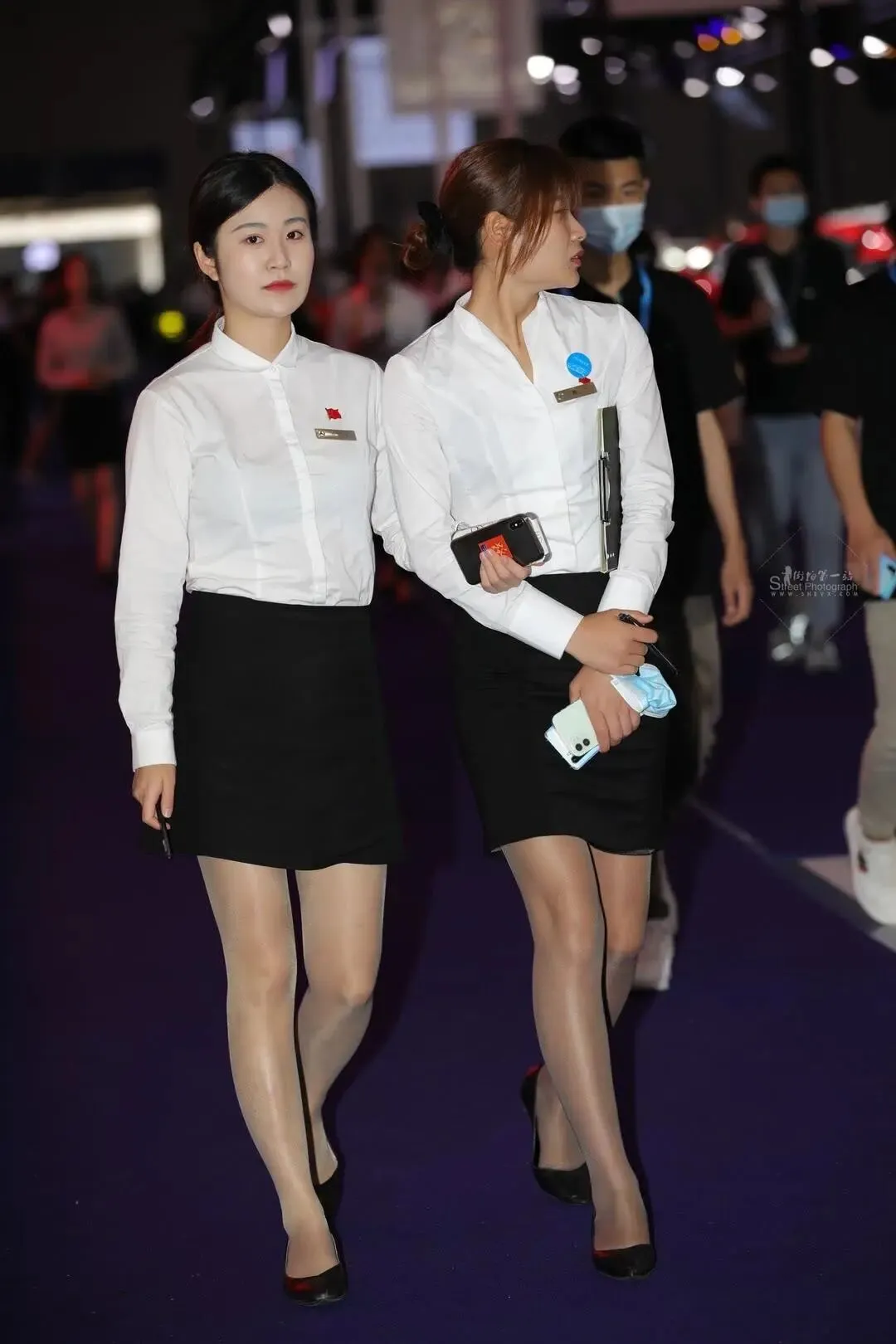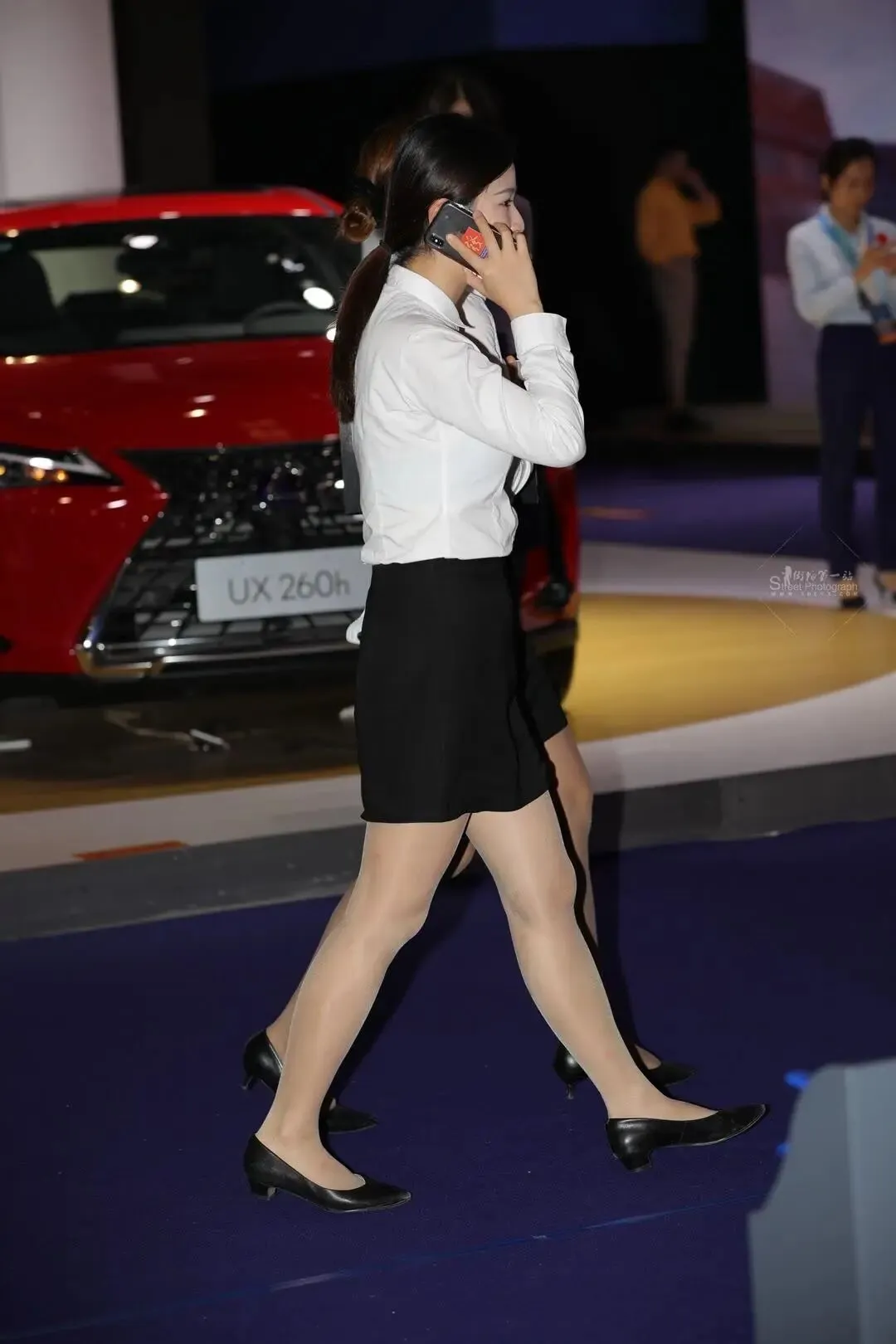 右边的姐姐正弯腰和同伴说话,头发扎成高马尾,发尾在颈后翘起个小弧度。她手里攥着本黑色文件夹,夹着几张打印的车型参数,文件夹边缘被磨得有些发白。左手垂在身侧,指尖捏着部浅蓝色手机,指甲修剪得圆润,涂着淡粉色甲油。最引人注目的是她的脚——套着双尖头细跟浅口鞋,鞋跟约三厘米,漆皮黑得发亮,把脚踝勒出道浅浅的凹陷。肤色丝袜薄得像层雾,紧紧贴着皮肤,脚背的毛细血管透过丝袜显出淡青色的纹路,脚趾细长,趾缝间透出点肉粉,足跟饱满得像颗剥了壳的荔枝,皮肤细腻得能看见毛孔里的光泽。