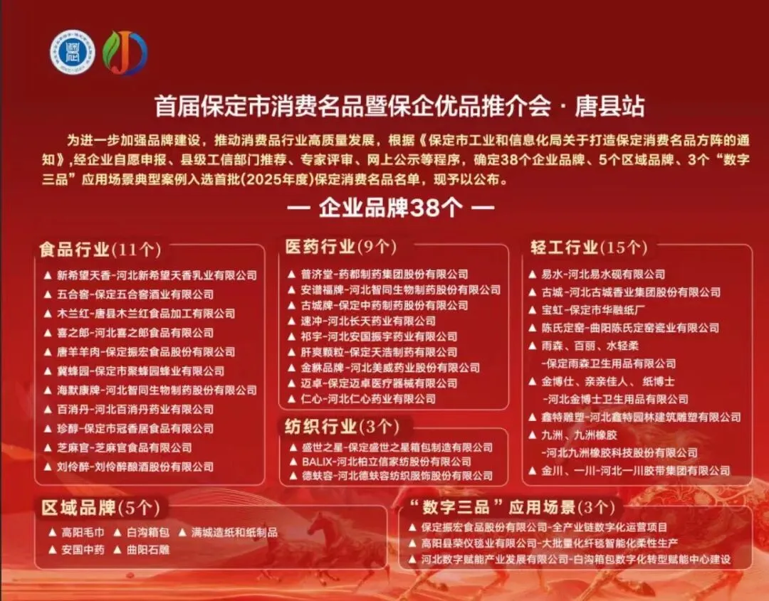 1月13日,保定市工业和信息化局正式公布首批(2025年度)保定消费名品名单,为保定消费品工业高质量发展按下“加速键”。本次名单覆盖食品、医药、纺织、轻工四大行业领域,囊括38个企业品牌、5个区域品牌及3个“数字三品”应用场景典型案例。所有入选品牌均在产品创新力、市场竞争力、品牌影响力及消费者口碑等维度历经严苛筛选,是“保定质造”的标杆代表。