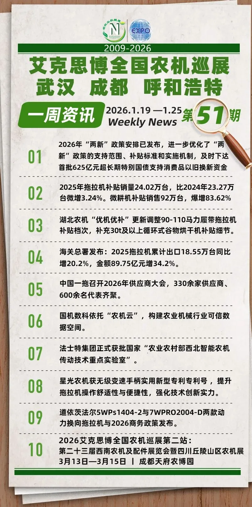 4. 海关总署发布:2025拖拉机累计出口18.55万台同比增20.2%,金额89.75亿元增34.2%。