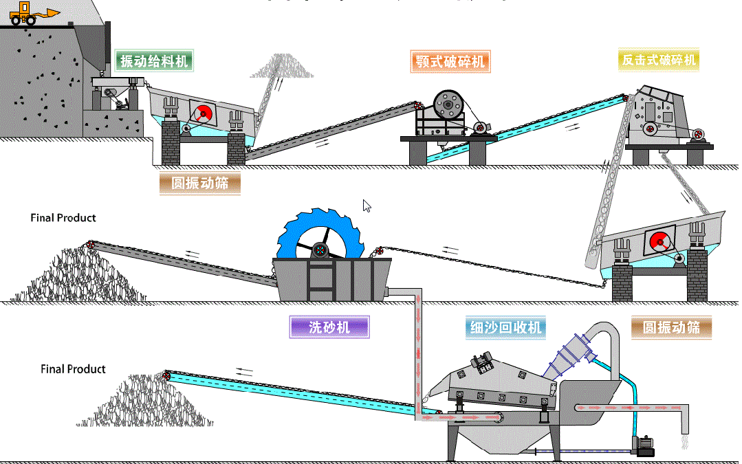 具体阐述:需科学设计给料、破碎、筛分、输送、除尘、智能控制等各模块的衔接与匹配,消除瓶颈工段。例如,优化筛分效率可减轻破碎负荷;配置高效的干法除尘或水处理循环系统,不仅是环保要求,更是降低损耗、提升产品纯净度的关键。