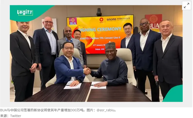 非洲华人先锋报1月26日讯 近日,尼日利亚知名企业 BUA 水泥(BUA Cement Plc)宣布与中国工程公司 CBMI 签署一份价值 2.4 亿美元的合作协议 —— 将在尼日利亚索科托工厂新建一条年产能 300 万吨的水泥生产线。这一项目不仅是双方 15 年合作的延续,更将推动 BUA 水泥总产能突破 2000 万吨,为尼日利亚北部基建发展注入关键力量。