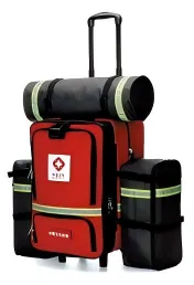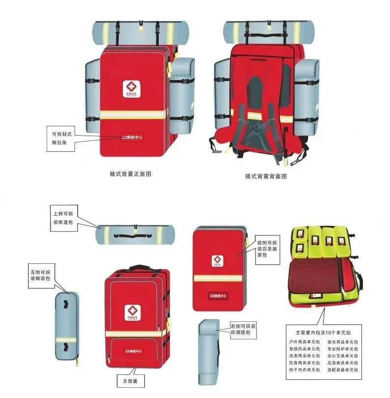 1 | 应急背包(箱式背囊) | 1.尺寸:34cm*21cm*53cm;面料:600D 加厚牛津布;颜色:红色。 2.携带方式:双肩。性能:防水阻燃 开袋方式:拉链。 3.结构:“1+X ”设计,2 个可拆卸 侧兜,1个可拆卸腰包。 4.反光条设计,卫生标识设计。 5.样式见图片