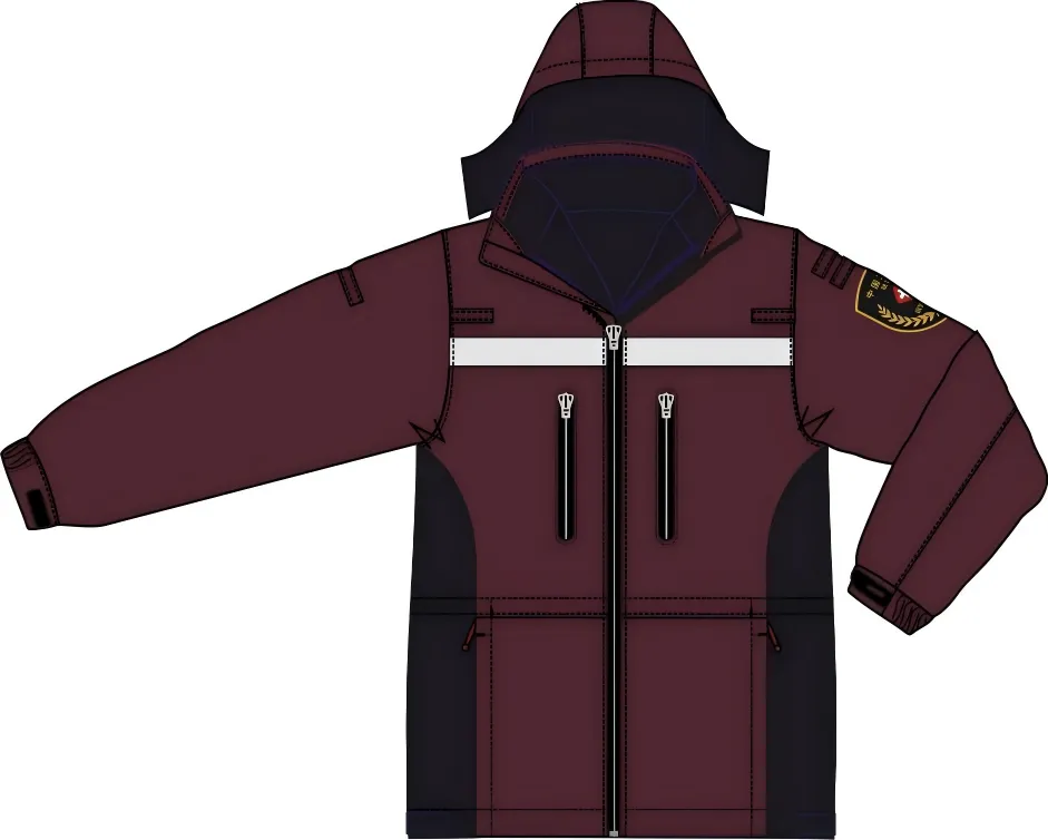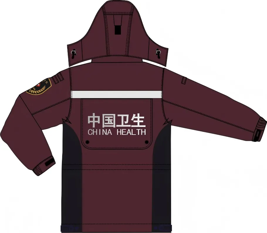 4 | 应急冬装(上衣) | 1.服装样式:见图片; 2.面料颜色绣红色/藏青色 3.网眼布上身里料颜色:蓝色 4.涤丝绸下身、袖及帽子里料颜色:蓝色 5.内领及下大袋布擦毛绒颜色:黑色 6.缝纫线颜色:与布料颜色相适合 7.拉链颜色:黑色 8.粘扣带颜色:黑色 9.松紧带颜色:白色 10.圆型松紧带绳颜色:黑色 11.注塑桶型弹簧吊钟颜色:黑色 12.注塑小圆珠颜色:黑色 13.金属气眼颜色: 黑古铜色 14.反光材料颜色:反光亮银色 15.注塑面金属按扣颜色:黑色