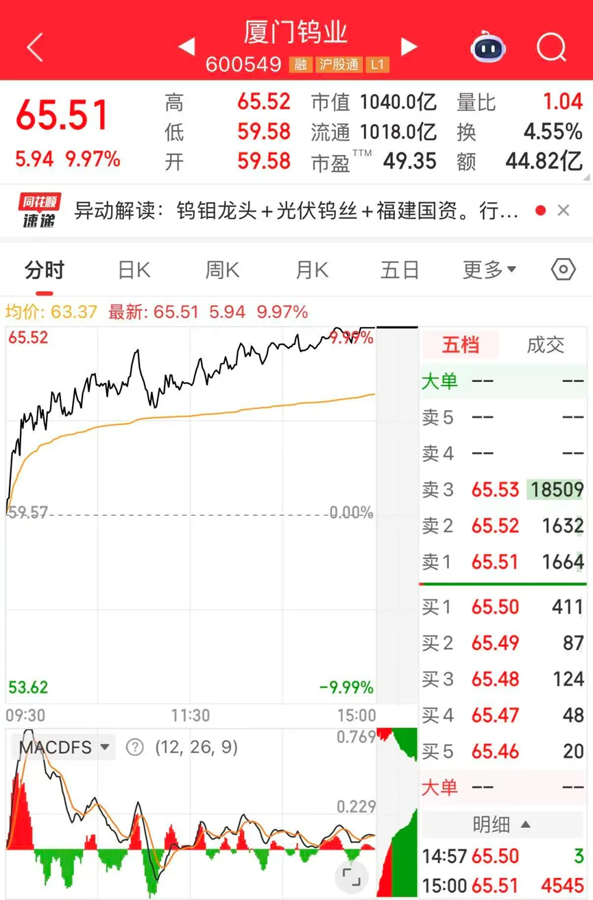 ▲厦门钨业总市值破千亿