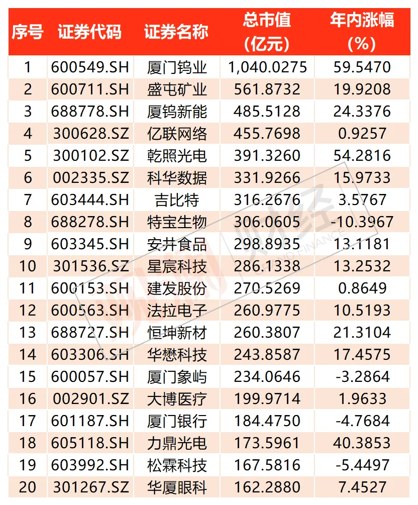 ▲截至1月26日厦门A股市值前20