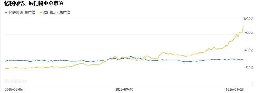 此前,亿联网络(300628.SZ)蝉联厦门A股市值第一的宝座多年。同花顺数据显示,由于厦门钨业的股价快速上涨,总市值在2025年8月29日超过亿联网络(之后一度被反超),从9月30日开始逐步扩大优势。