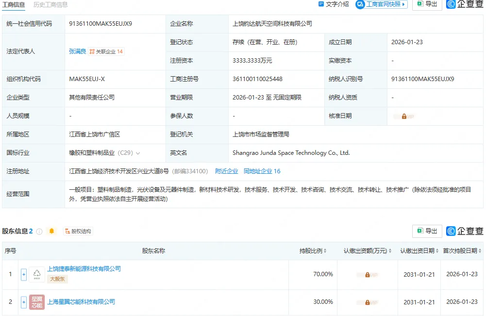 企查查显示,近日上饶钧达航天空间科技有限公司正式成立,法定代表人为张满良。