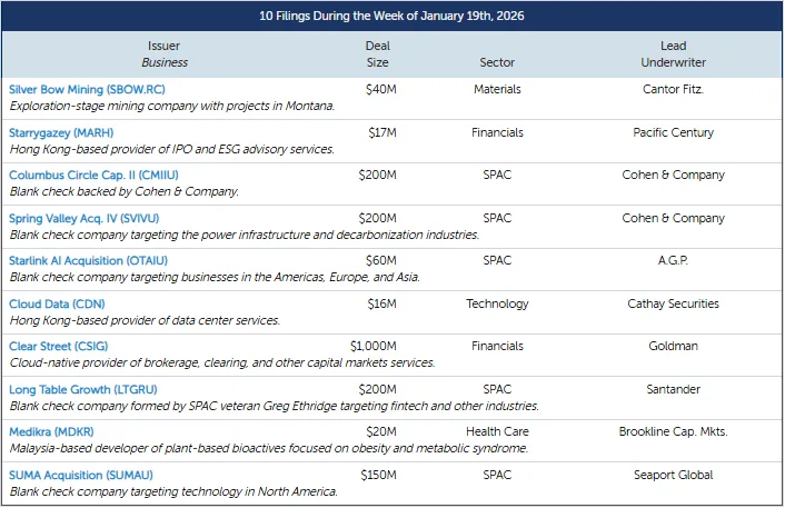 上周共有十家发行人提交了首次公开募股 (IPO) 文件,其中包括五家公司和五家特殊目的收购公司(SPAC)。Clear Street (CSIG )领跑,该公司提交的IPO申请预计募资10亿美元。这家云原生金融服务公司提供经纪、清算和其他资本市场服务。