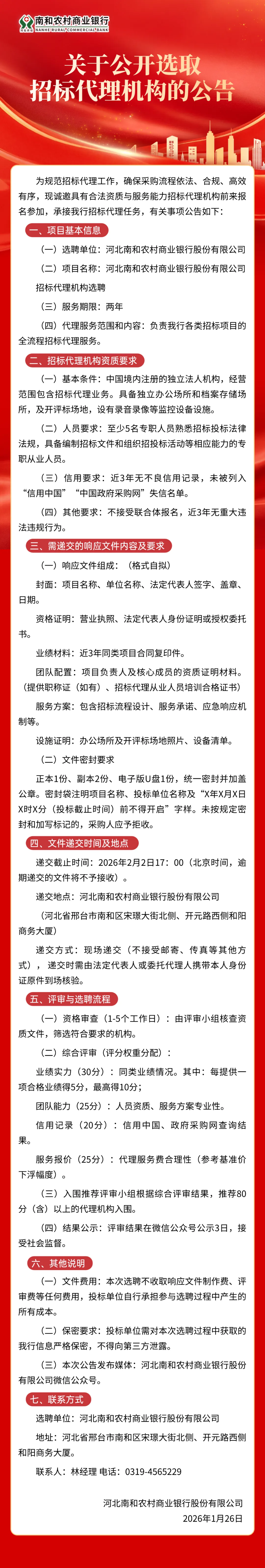 河北南和农村商业银行股份有限公司关于公开选取招标代理机构的公告