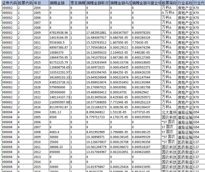证券代码 股票代码 年份 捐赠金额 是否捐赠 捐赠金额取对数 捐赠金额与总资产比值 捐赠金额与营业收入比值 股票简称 行业名称 行业代码 所属省份代码 所属省份 所属城市代码 所属城市 是否stpt 是否金融 是否制造业 是否沪深上市 成立年份 上市年份