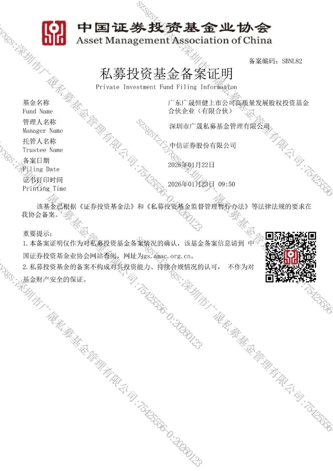 1月23日,广晟资本所属深圳广晟基金管理的广东广晟恒健上市公司高质量发展股权投资基金合伙企业(有限合伙)(简称“广晟恒健上市公司高质量基金”)在中国证券投资基金业协会顺利完成备案。该基金的成立与备案,标志着广晟资本在赋能广晟控股集团控股的上市公司高质量发展方面迈出实质性步伐。