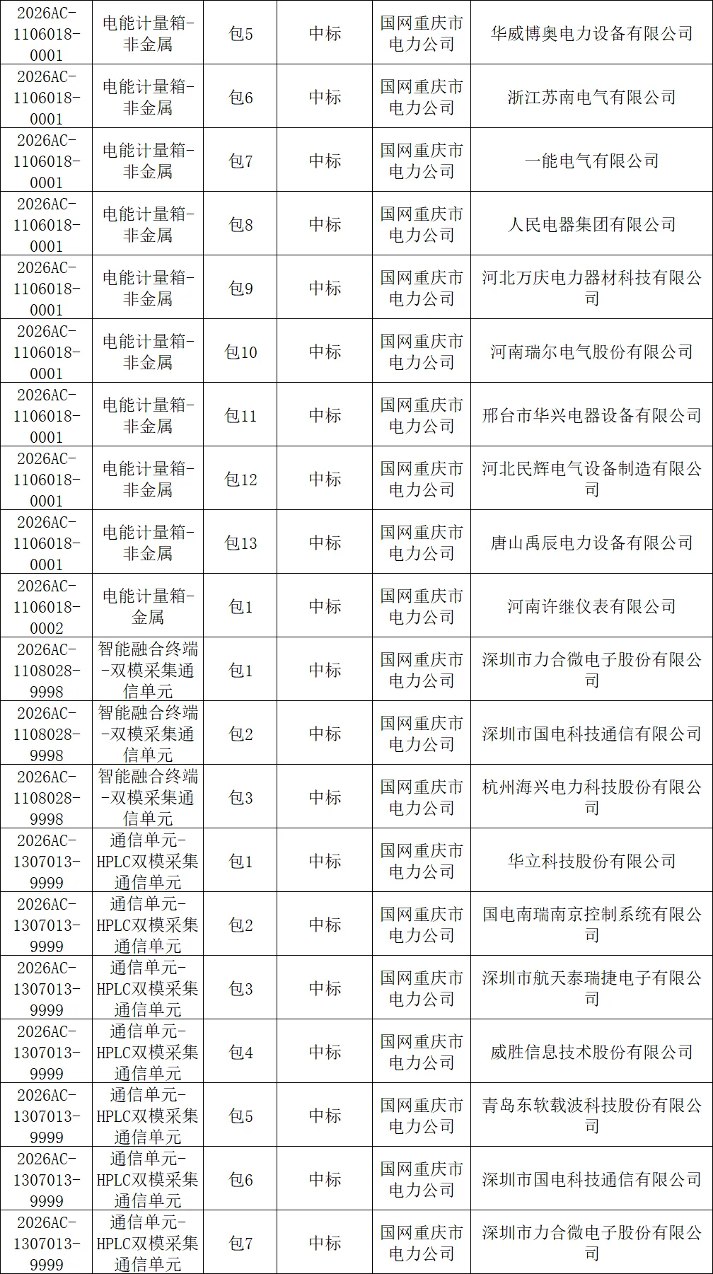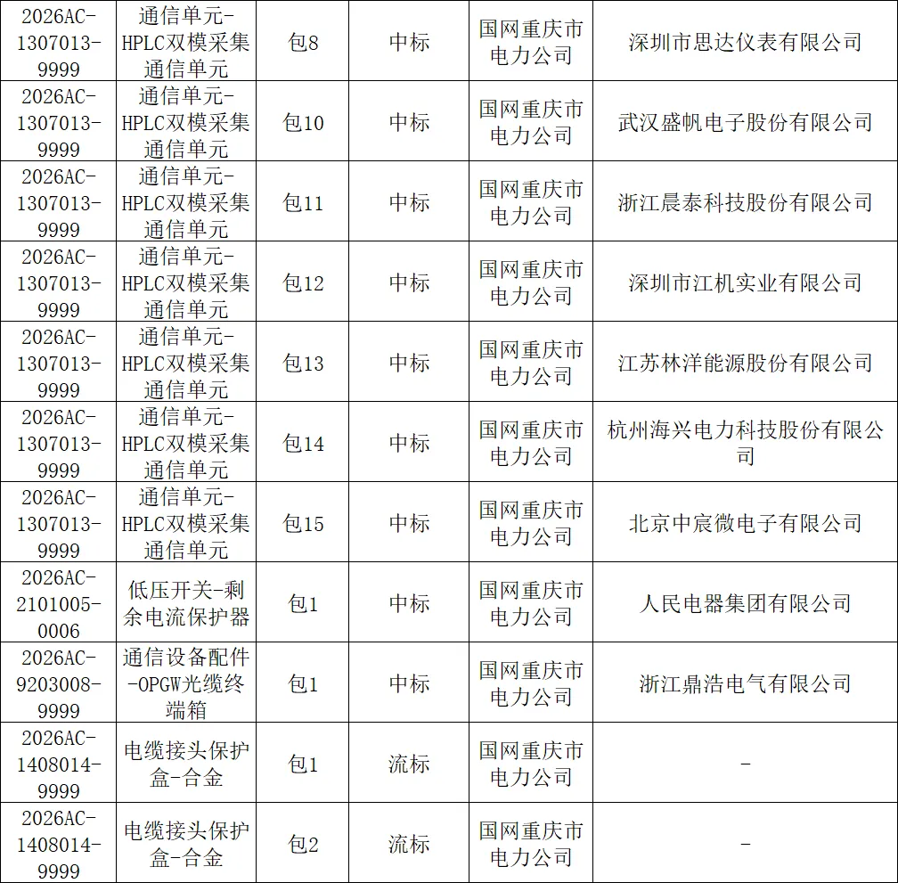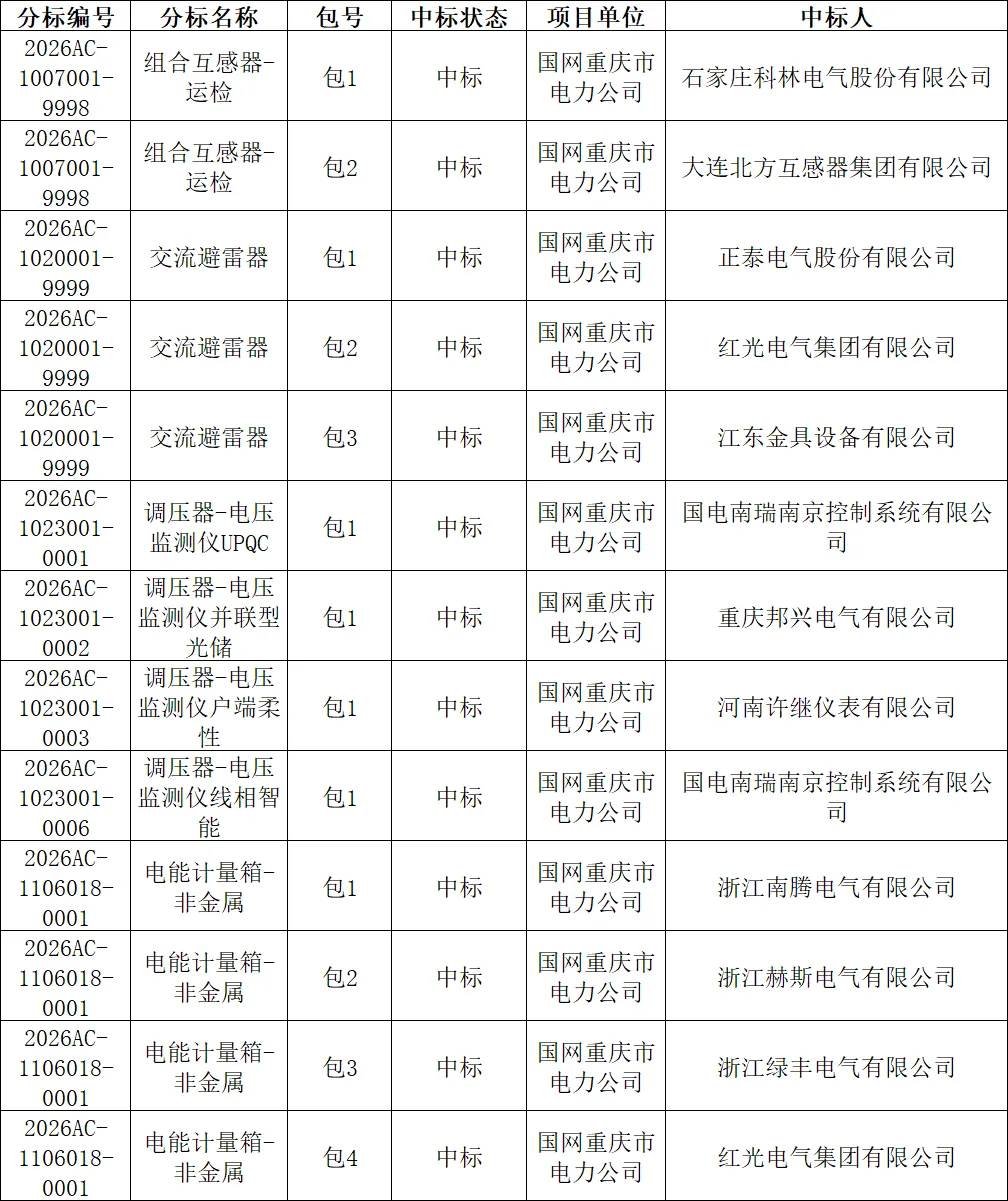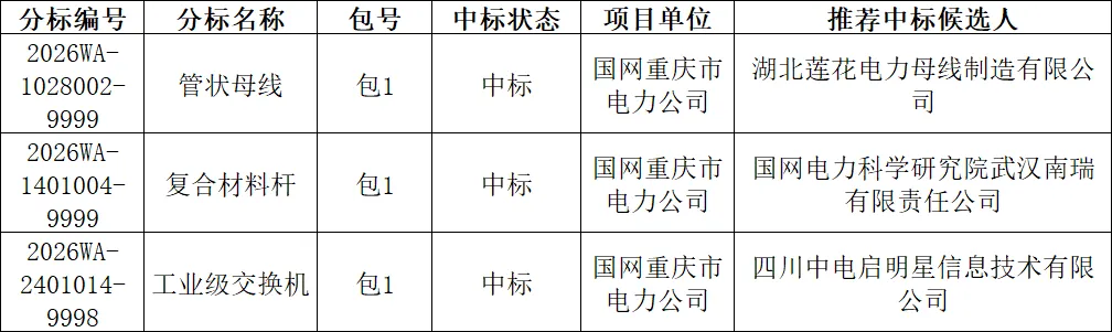 国网重庆市电力公司2026年新增第一次物资公开招标采购中标结果公告