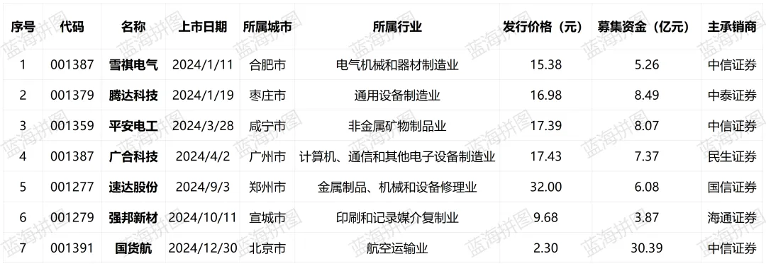 2024年,深主板上市7家公司,合计募集资金69.52亿元,主要区域分布在安徽省,主要行业较分散。