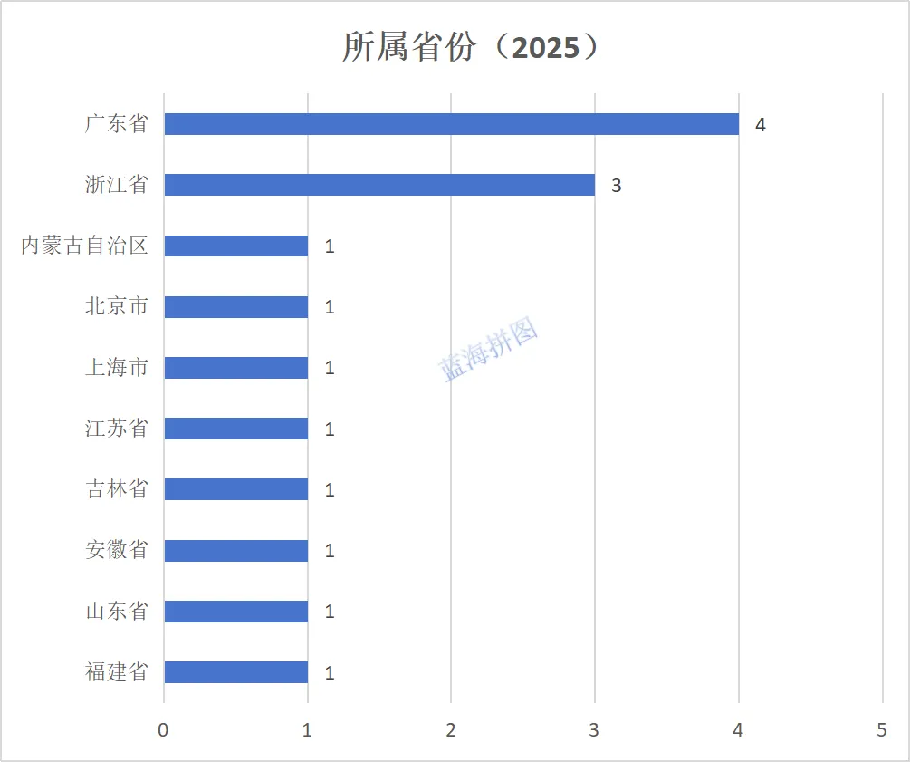 主要的省份分别是:广东省(4)、浙江省(3)。