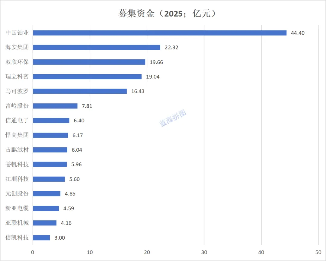 募集资金排名前三的上市公司分别是:中国铀业(44.40)、海安集团(22.32)、双欣环保(19.66)。单位:亿元。
