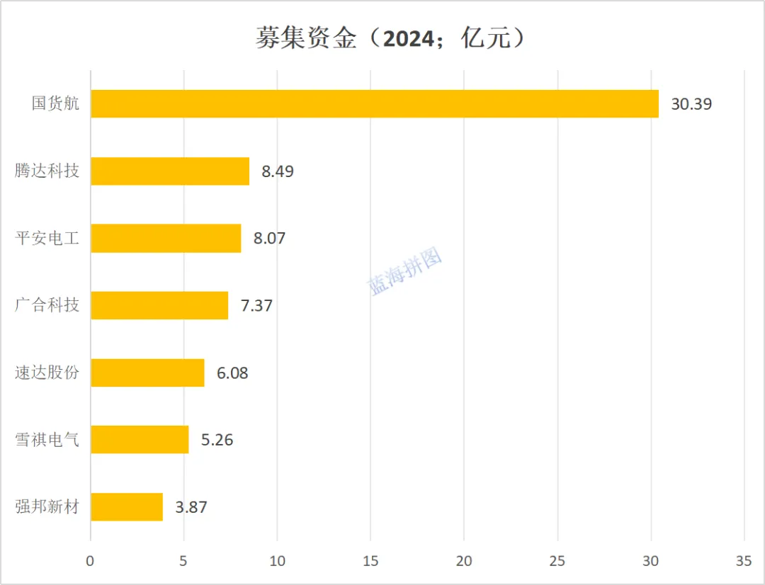 募集资金排名前三的上市公司分别是:国货航(30.39)、腾达科技(8.49)、平安电工(8.07)。单位:亿元。