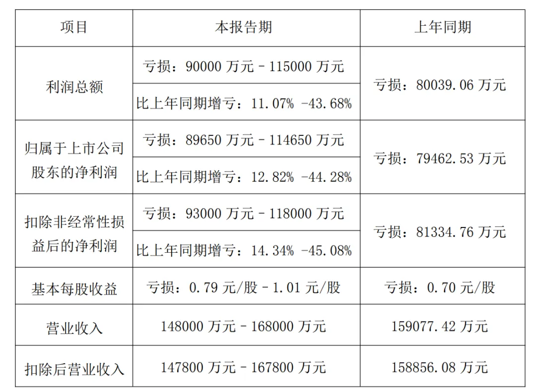 经财务部门初步测算,公司预计 2025 年年度实现归属于母公司所有者的净利润为-32,000.00 万元到-49,000.00 万元,与上年同期相比亏损收窄。预计归属于母公司所有者的扣除非经常性损益的净利润为-46,000.00 万元到-63,000.00万元,与上年同期相比亏损收窄。