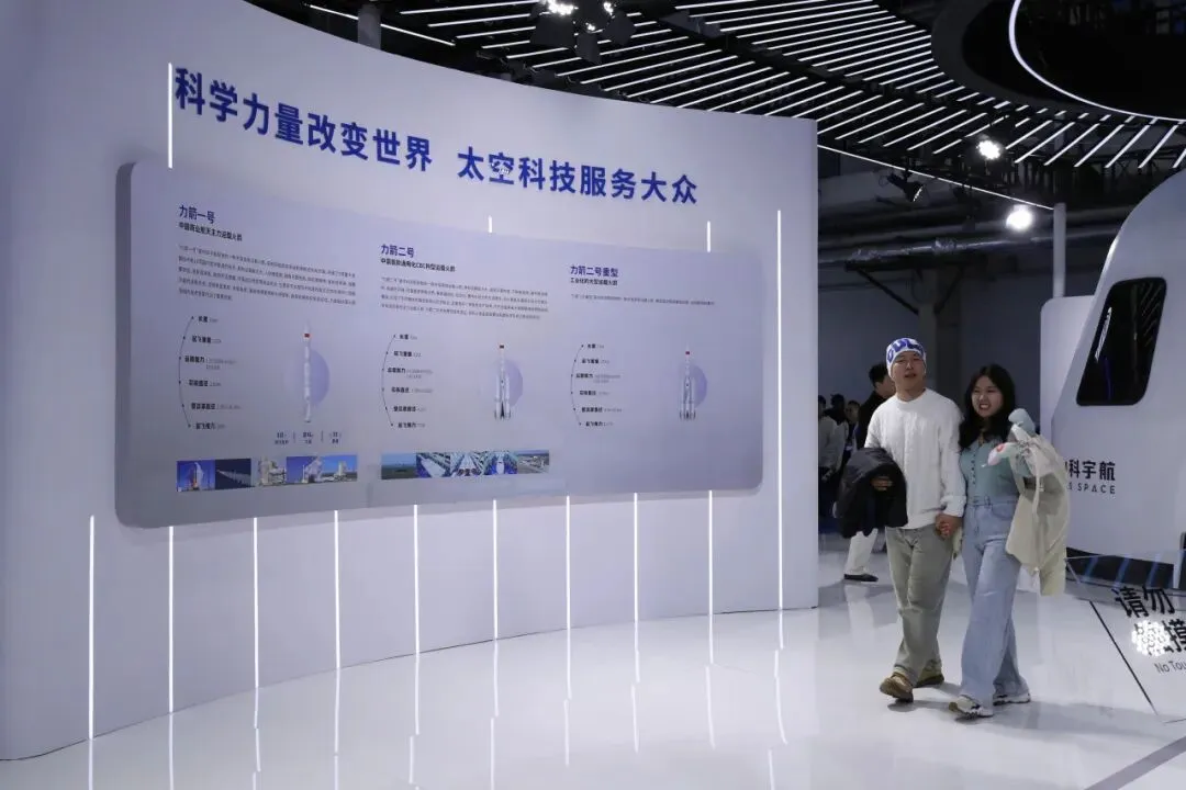 观众参观星河动力航天展出的多款运载火箭