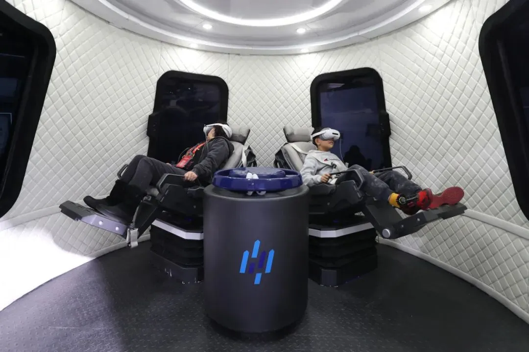 观众在中科宇航展馆参观体验“力鸿二号”飞行器模型,该飞行器可应用于太空旅行。