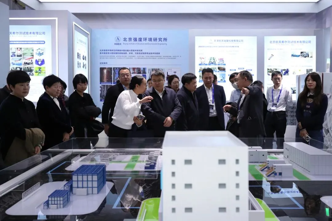 观众在北京强度环境研究所展台参观展出的火箭大街商业航天共性试验平台模型