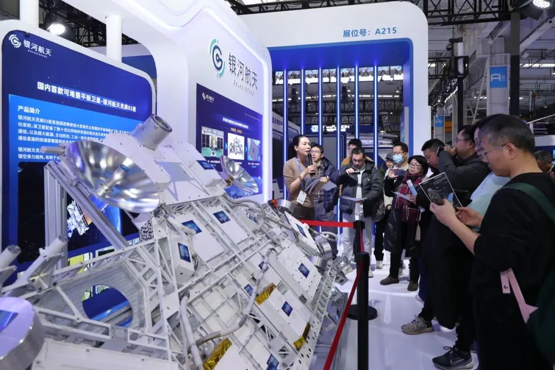 观众在银河航天展台参观展出的可堆叠平板卫星“灵犀03星”模型。