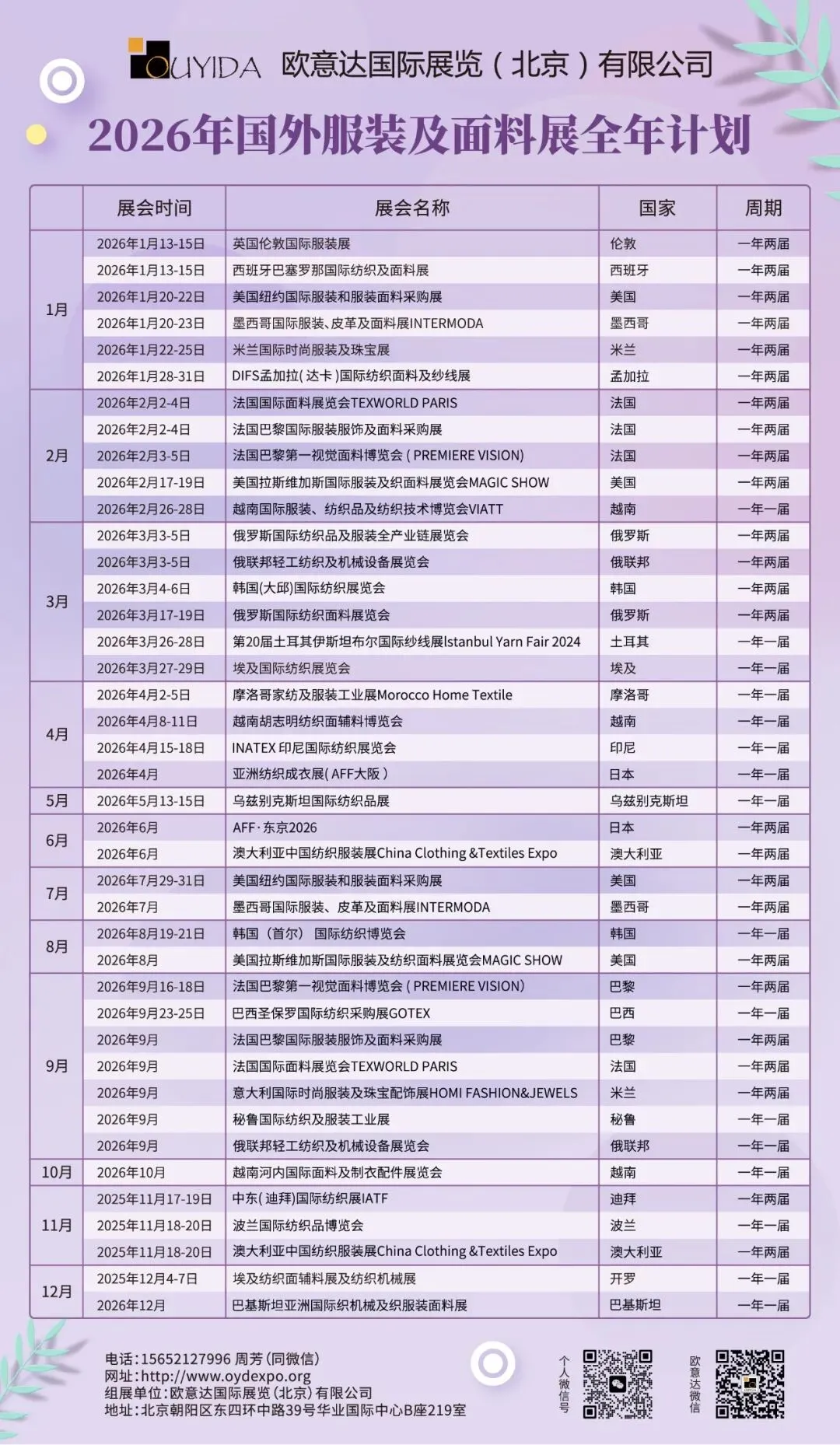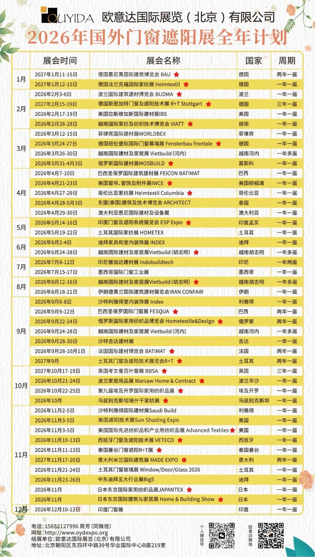 欧意达经过二十余年的磨砺,厚积薄发,率先在家用纺织品、服装及面料、家具装饰面料、门窗遮阳及建材相关行业确立了不可撼动的市场地位。始于会展,专注会展。我们愿以丰富的经验为您的产品进入国际市场架起腾飞的桥梁,帮助您结识新的贸易伙伴,不断开拓新的海外市场,成为您迈入国际市场的最佳捷径。