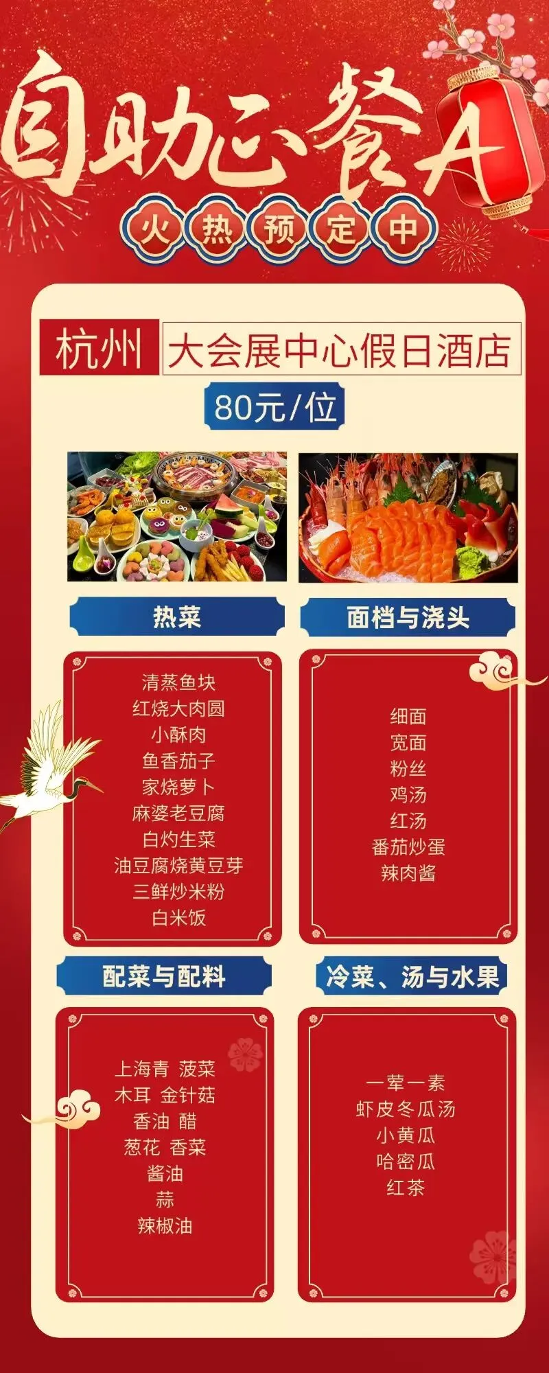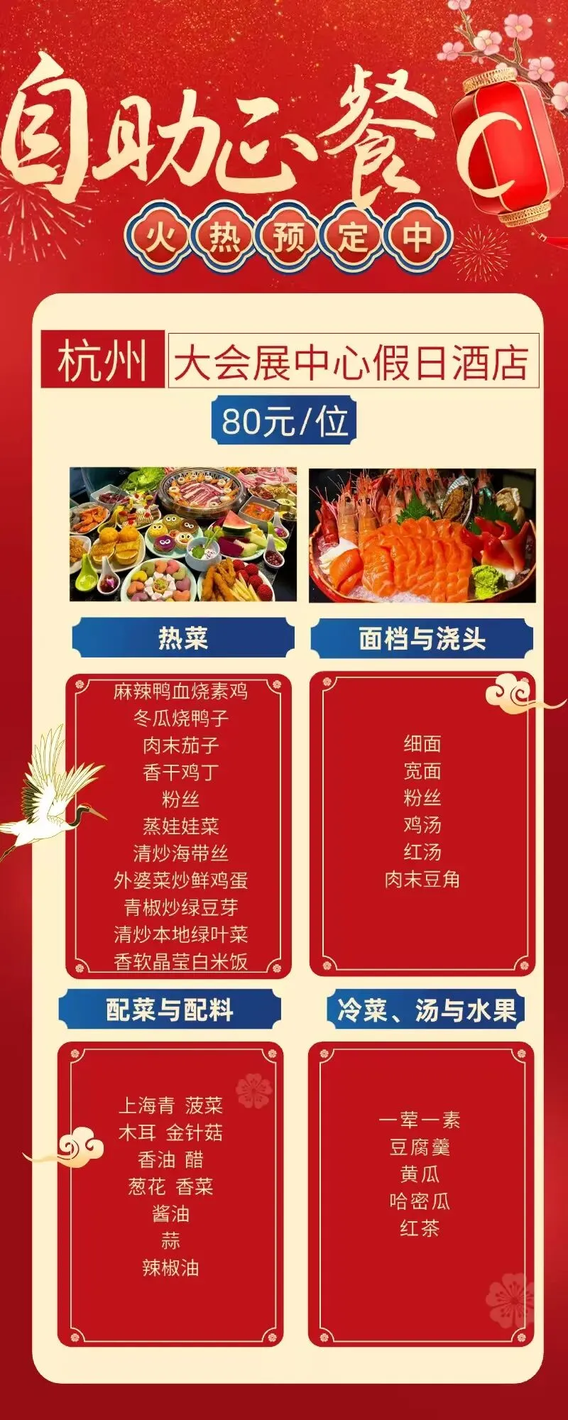 2,自助年夜饭标准188元/人,2人起订;所有早餐、正餐均为自助餐,报名前请知晓,费用只补不退;