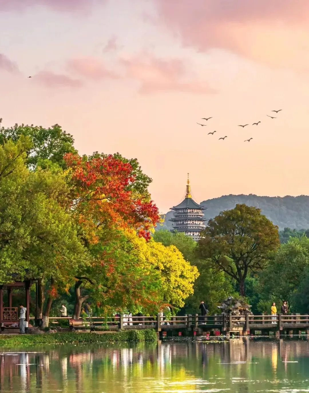 待到霜叶染红栖霞岭,残荷在水面勾勒出疏影。斜阳洒落雷峰塔,金辉与丹枫交织,宛如一幅流动的暖色长卷。
