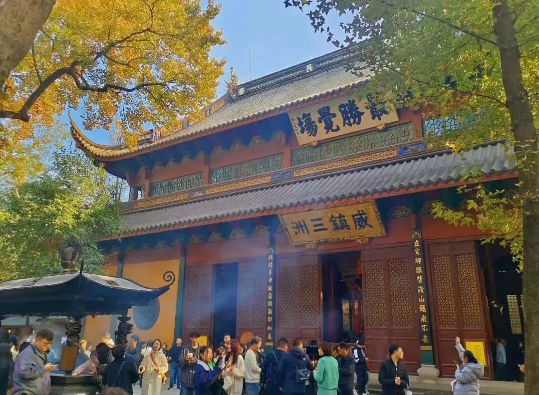 步入山门,霜叶与金黄银杏勾勒出层叠的暖色,古刹飞檐在清冽空气中愈显沉静。冷泉潺潺,氤氲香火与薄雾交织,恍若仙境。
