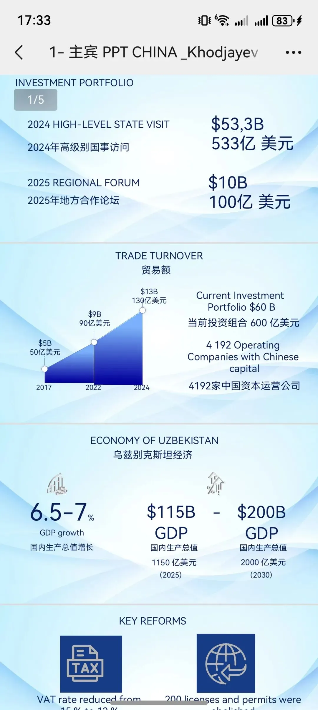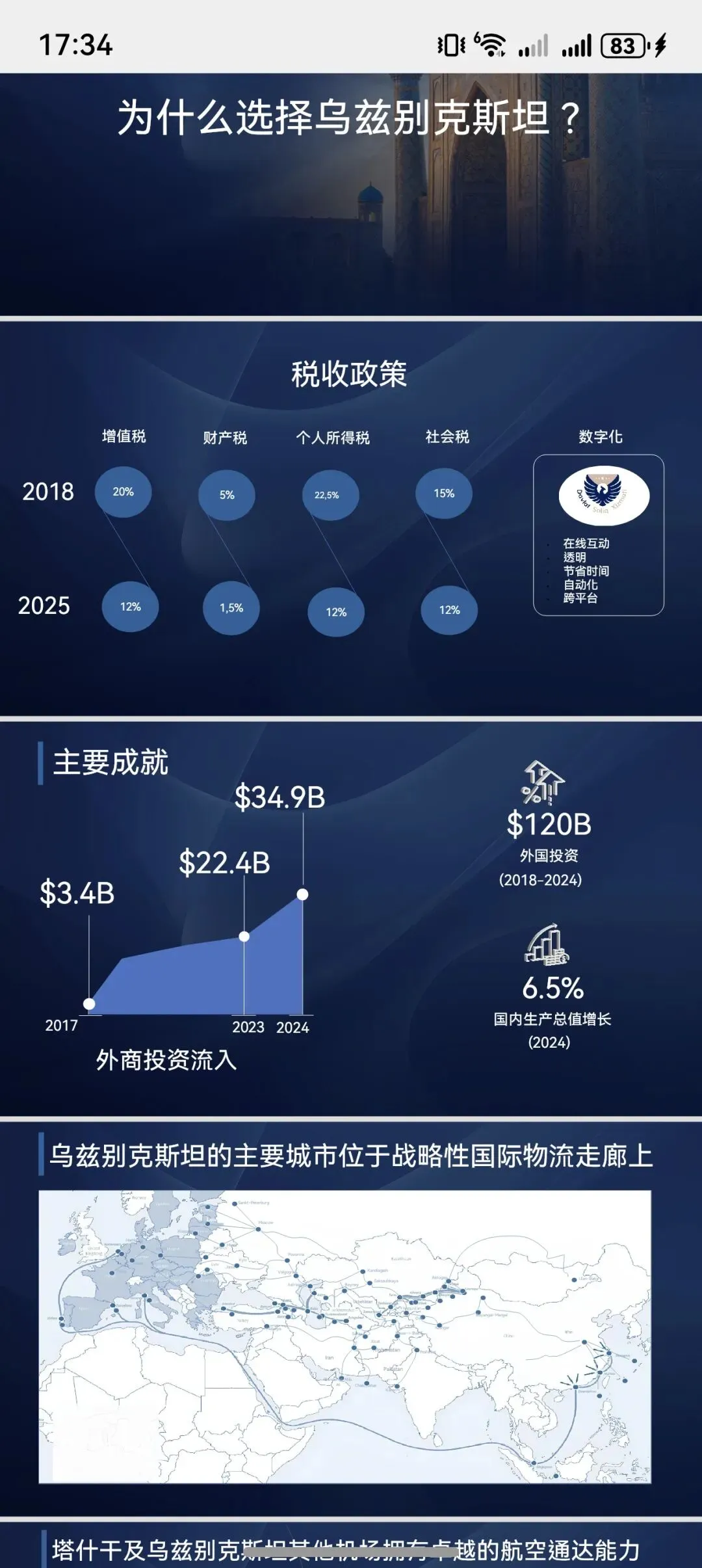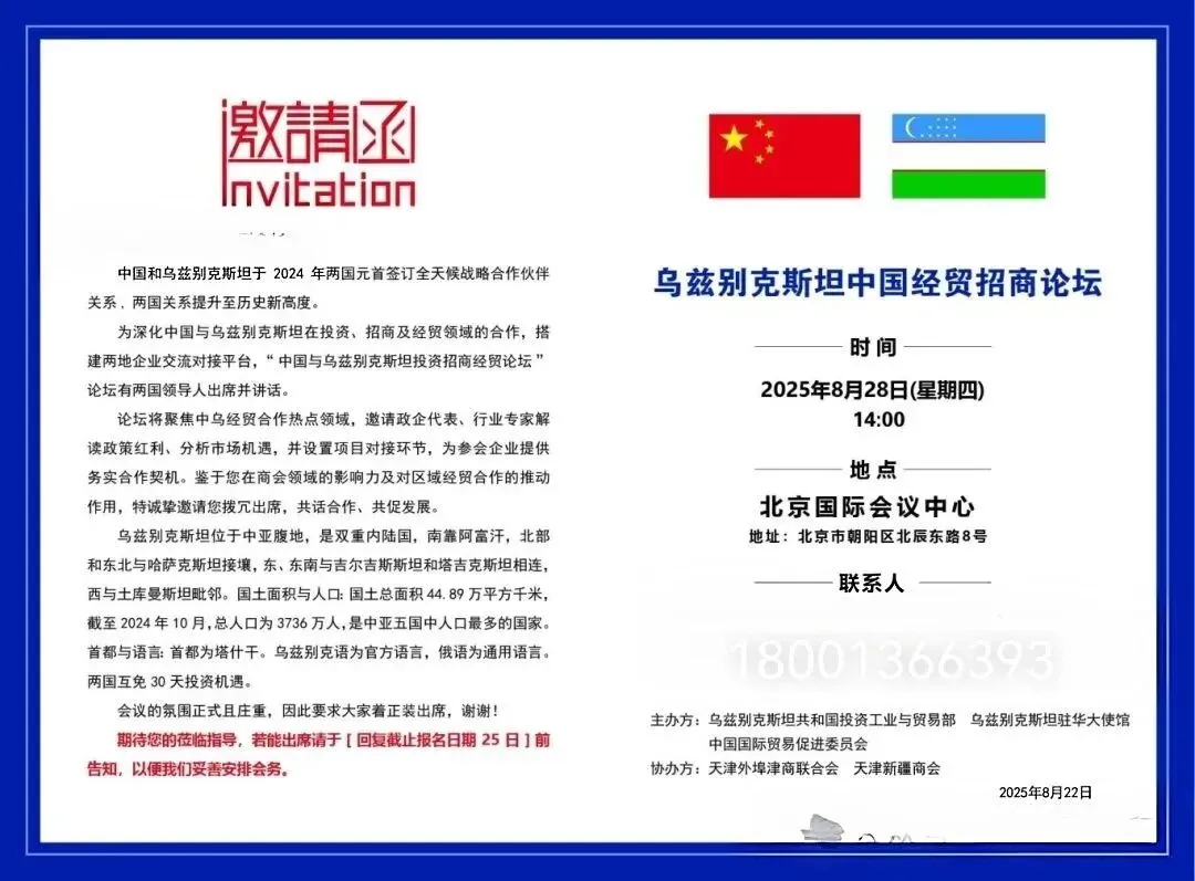 乌兹别克斯坦??副总理将代表该国出席上海招商论坛,这标志着活动从州政府层面正式升级为国家级别——这不仅是对前两次活动成果的肯定,更体现了中乌合作的重视程度再上新台阶,届时将带来国家层面的重磅招商信息!农业、基础设施、建筑、纺织、酒店配套设施等为主,已项目对接为主,其它为辅!驼铃声声未远,浦江潮涌再邀!由于众多企业未能亲临盛会,为回应各界热切期待,乌兹别克斯坦共和国系列招商论坛活动将于2025年8月移师上海,以“丝路明珠耀浦江”为主旋律,在黄浦江畔畅想中乌经贸合作新篇章。
