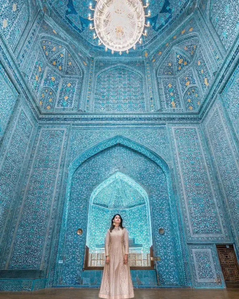 沙赫静达的意思是“永生之王”,沙赫静达陵墓群是撒马尔罕统治者及其家属的坟墓,与比比·哈内姆清真寺的蓝色瓷砖不同,这里的主色调是青色。湛蓝色、天青色和奶白色的花纹交错盘恒,整个陵墓的街道都是由这种花纹组成,虽然是陵墓,却有种华丽绚烂的浪漫感。
