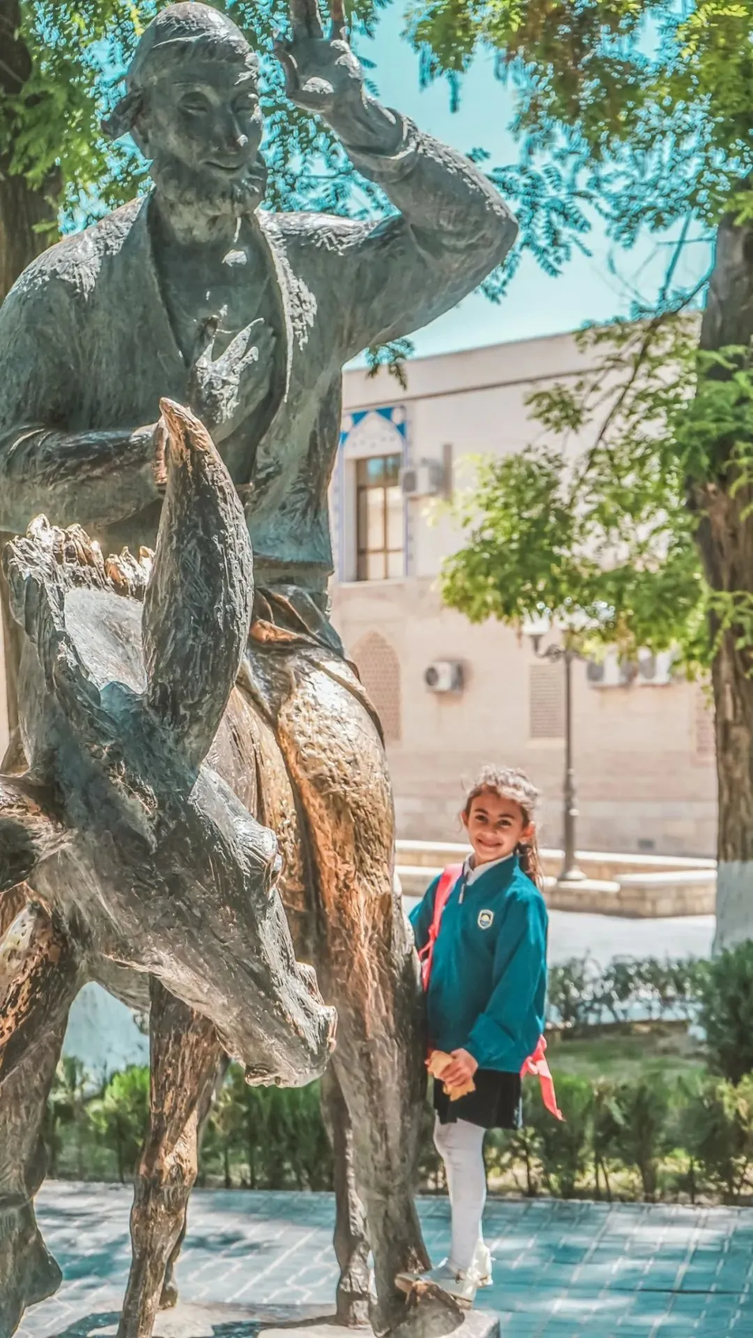 里亚比豪兹广场(Lyabi-Hauz)自1620年建成起,便是布哈拉老城的心脏,它以四方形水池为中心,周围遍植桑树。广场上有一尊霍加·纳斯尔丁(Hoja Nasruddin)骑毛驴的雕像,也就是我们熟知的阿凡提。阿凡提先生大概骑着毛驴走遍了从新疆到土耳其的整个中亚,他的家乡在中亚遍地开花,各国也流传着不同版本的阿凡提故事。