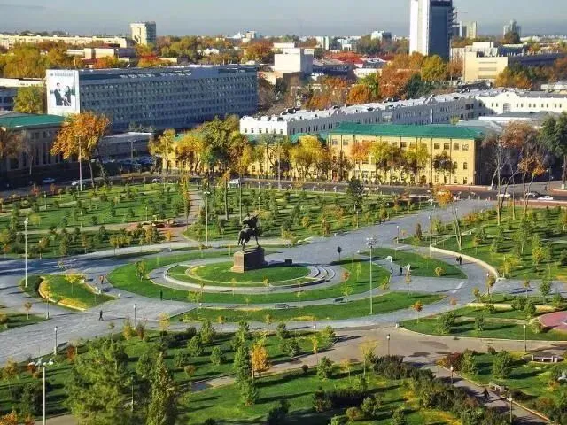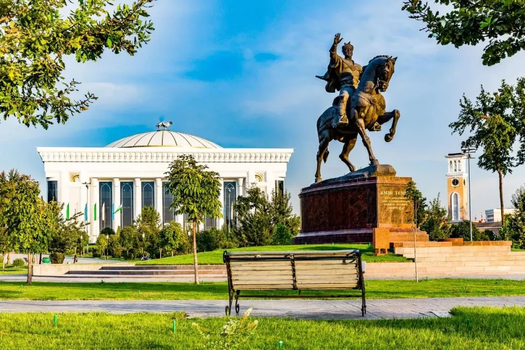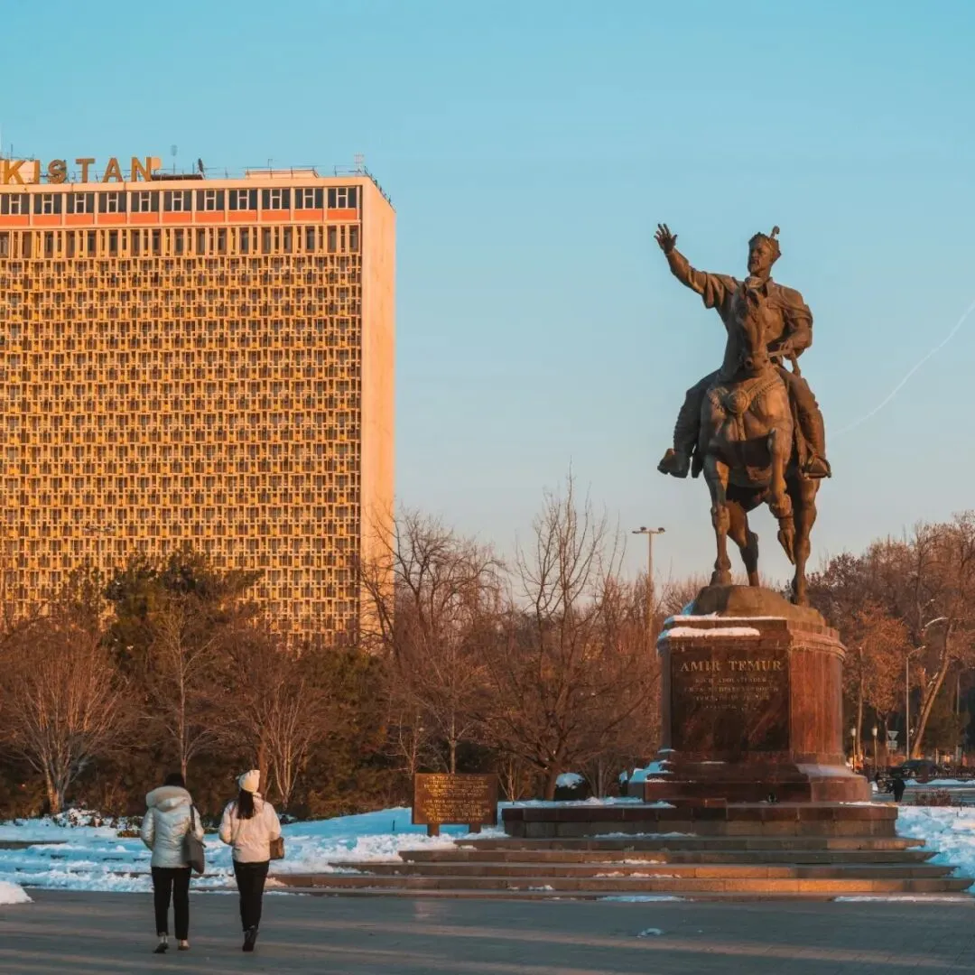 帖木儿广场(Amir Timur Maydoni)的中心是一尊帖木儿骑马雕像,但帖木儿不是第一个被尊奉在这里的人物,俄国人占领塔什干期间,考夫曼将军、列宁、斯大林、马克思都曾在此各领风骚数十年。广场附近的圆形建筑是帖木儿博物馆,希腊神庙般的建筑是国家银行,扁平的几何体建筑是乌兹别克斯坦酒店,这座极具苏联审美的酒店至今也还在乌兹别克斯坦的高级酒店名列。